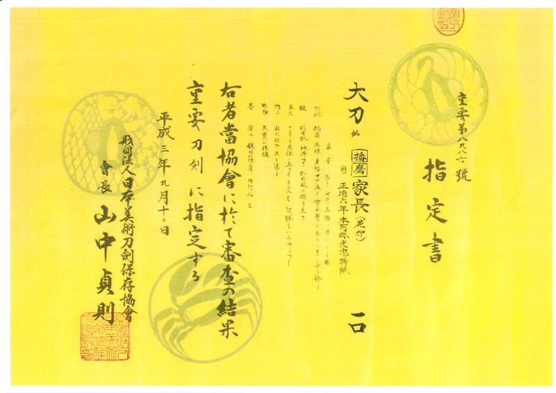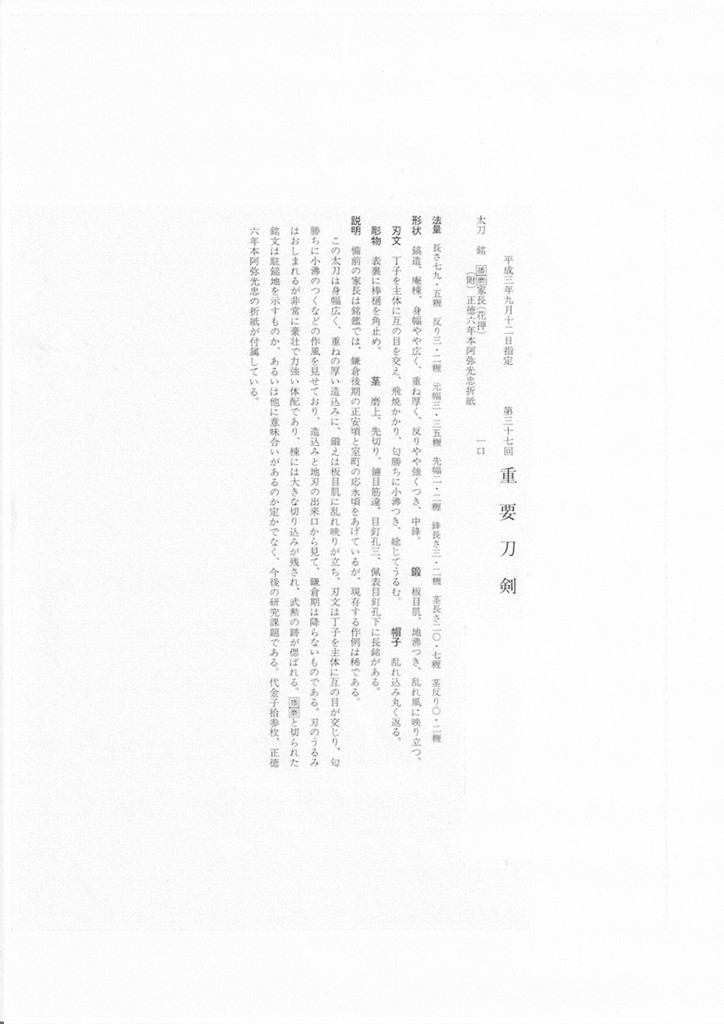 本阿弥光忠は本阿弥家13代当主で、享保4年(1719年)に将軍徳川吉宗の命で名刀の選定にあたって『享保名物帳』を編纂した人物としても知られています。 正徳6年(1716年)に本阿弥光忠が折紙を添えたとされる太刀として、「安綱」の銘があるものが刀剣博物館に所蔵されています