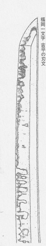 本作の特徴と同じ高低差のある刃文は丁子刃を主体とし、互の目交え、飛び焼きがあるところなど、総体的に福岡一文字「吉平」と類似したところあり。父、吉家は平安時代末期~鎌倉時代初期刀工、福岡一文字派。同銘に山城国「吉家作」の三字銘を切ります。本阿弥光忠の「備前国」は肯けるところあり。