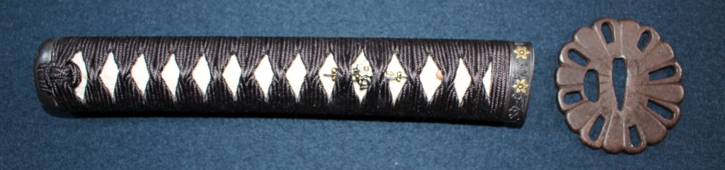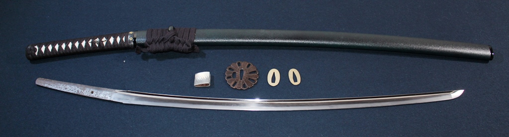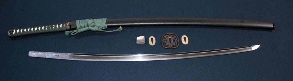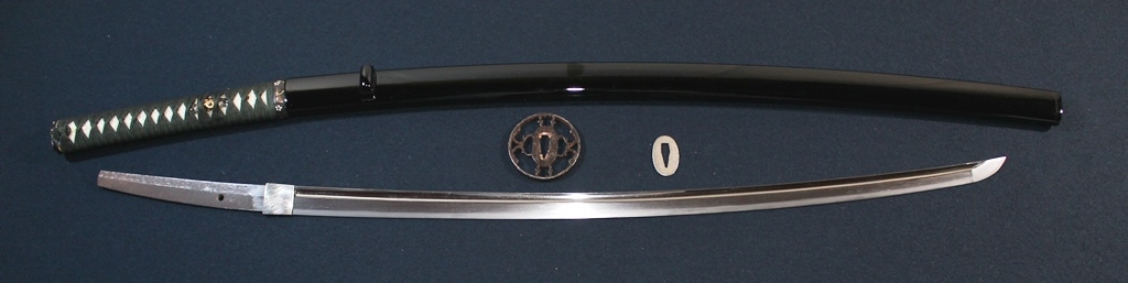3 太刀。 銘 無銘 。 長さ:2尺3寸1分(70.0cm)。 反り1・8cm。 目釘穴1個。 刃文:直ぐ刃に小乱れて小沸え出来。地:杢目。帽子:小丸に掃きかける。樋彫あり。 刀身重量:鞘除いて(780g程)。 諸工作全て新しい (8寸柄注文作り:本鮫1枚使用。柄巻き:正絹黒色。鞘:濃緑色石目。・現代金具:鍔時代物。樋彫りあり。はばき銀無垢一重。研ぎ・下げ緒:黒正絹 )。 価格:390,000円(税込)。 [銃砲刀剣類登録書 岐阜県 84358号 ] ↓ ↓ ↓